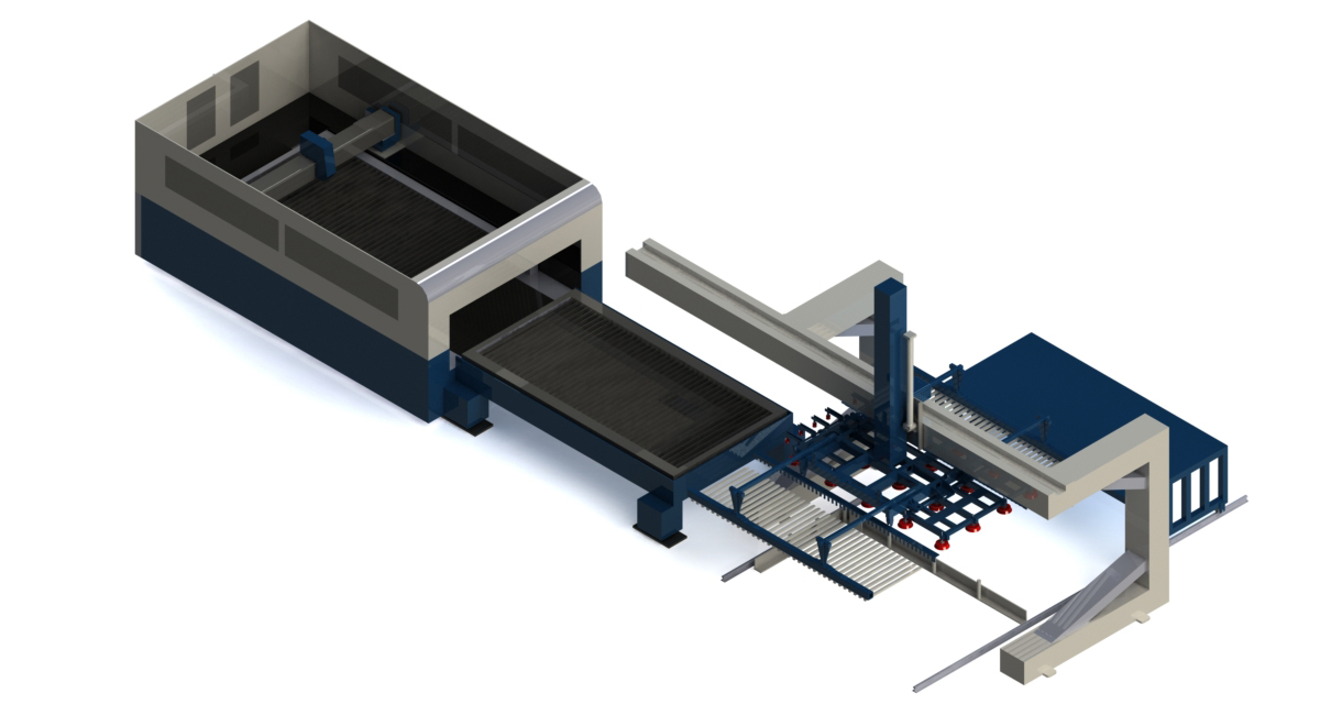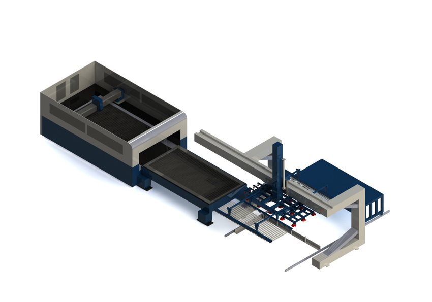 本系統(tǒng)由一臺(tái)ALG200激光上下料機(jī)器人,一臺(tái)成品小車,一個(gè)板材預(yù)定位裝置,一臺(tái)3015激光切割機(jī)以及安全圍欄光幕(選配)等組成,其總裝的三維如圖。